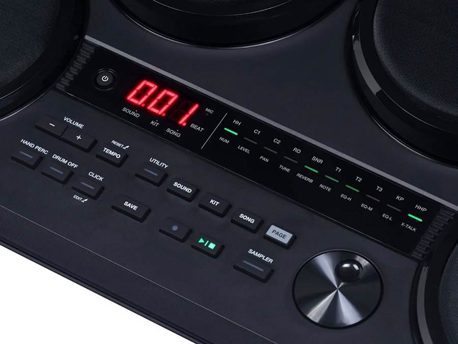 • Panneau de contrôle : puissance, volume +/-, tempo, utilitaire, son, kit, chanson, page, percussion à main, batterie désactivée, clic, enregistrer, enregistrement, démarrage/arrêt, échantillonneur