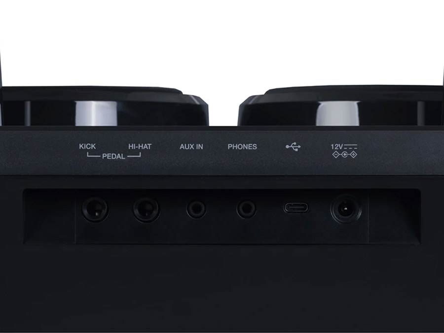 • Connexion : une prise casque / sortie USB-C (midi) (1 x prise auxiliaire 1/8″) (1 x pédale 1/8″) (contrôle de grosse caisse et de charleston)